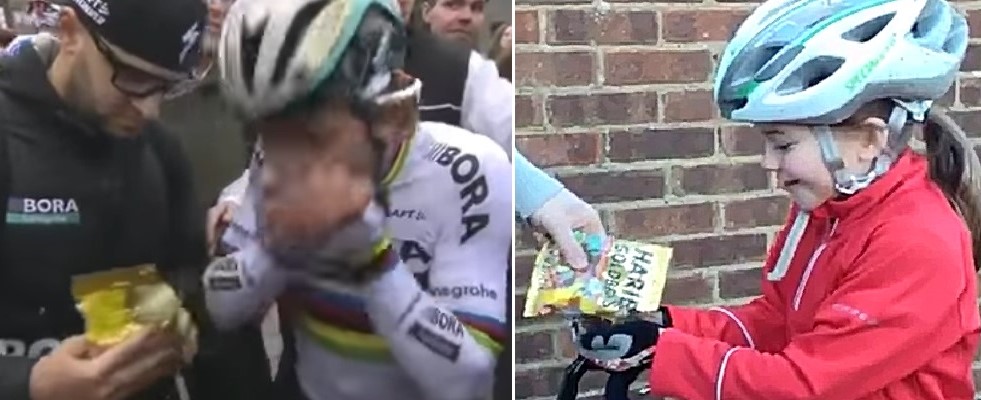 Sagan venceu a Kuurne-Bruxelles-Kuurne, mas mais do que a sua primeira vitória do ano e pela nova equipa, a Bora-Hansgrohe, foram as gomas que comeu mal cortou a meta que fizeram um grande sucesso. O eslovaco parou a bicicleta e com os repórteres fotográficos e de imagem à procura do melhor plano, com os jornalistas a procurarem as palavras do campeão, eis que Sagan mete as mãos em concha e um membro do staff da Bora-Hansgrohe deita-lhe várias gomas, com a marca bem visível. Não só foi visto por milhões logo no momento, como o vídeo se tornou viral. Qual a melhor comida para iniciar a recuperação após uma corrida? Para Sagan são as gomas! Foi a espécie de slogan oficioso que começou a aparecer nas redes sociais.
