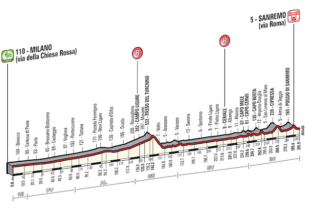 Há uns anos, a organização tentou alterar um pouco a essência deste monumento, acrescentando mais umas subidas, mas há tradições que são mesmo para se manter e nas últimas edições, o percurso voltou ao formato mais conhecido desde a década de 80. Mas porque razão esperaramos até ao quilómetro 264 - quando começa a Cipressa - a ver atentamente a corrida, mesmo com um terreno sem grandes dificuldades? Simples. Quando se olha para a lista de inscritos vê-se que lá estão praticamente todos os grandes nomes do sprint e outros ciclistas que adoram clássicas e todos ajudados por alguns dos melhores homens que se poderia pedir para uma corrida tão especial.